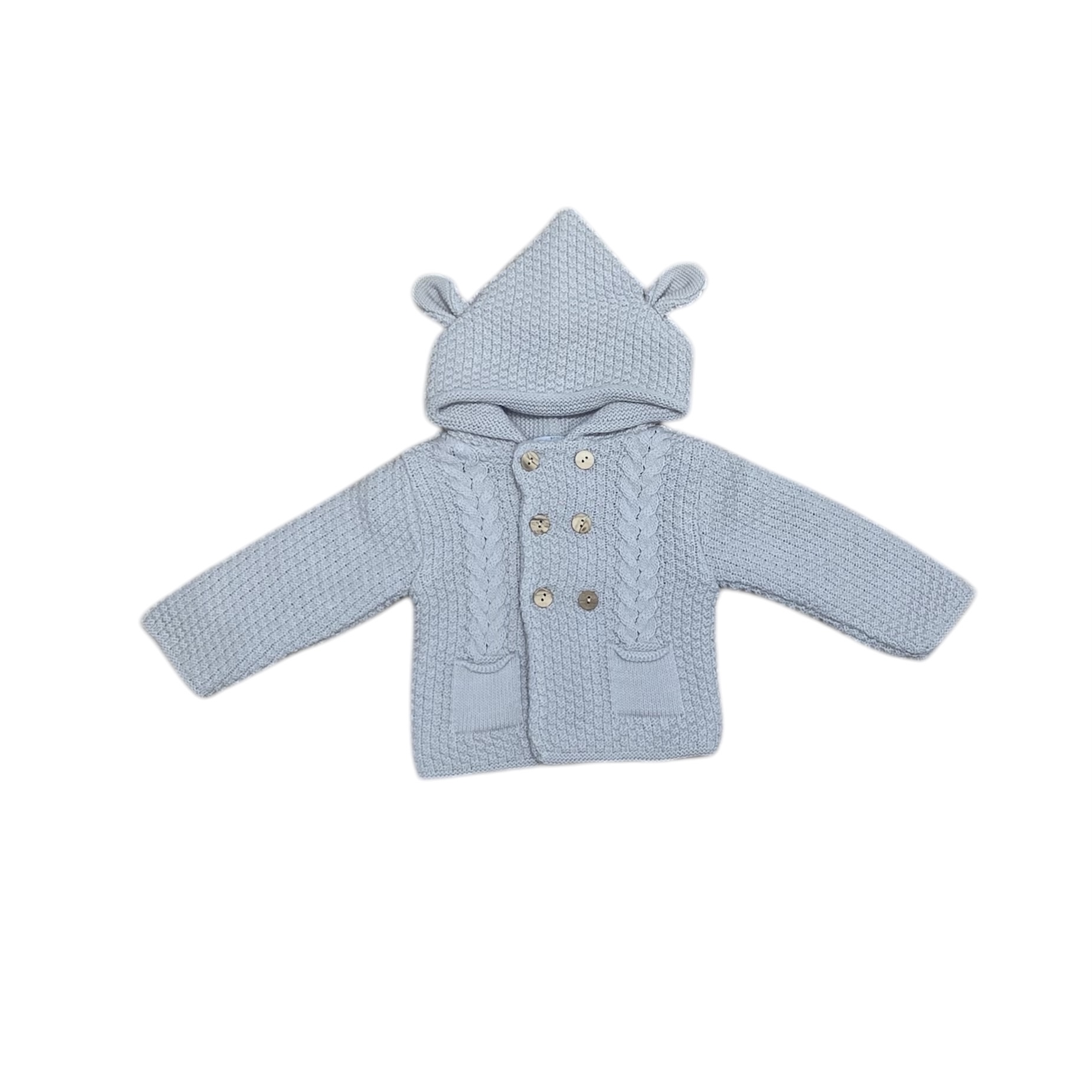 Abriga a tu pequeño con esta encantadora chaqueta de punto en color azul bebé, un básico imprescindible para los primeros meses. Confeccionada en suave tejido de punto, combina calidez y comodidad sin perder el estilo clásico que tanto nos gusta.