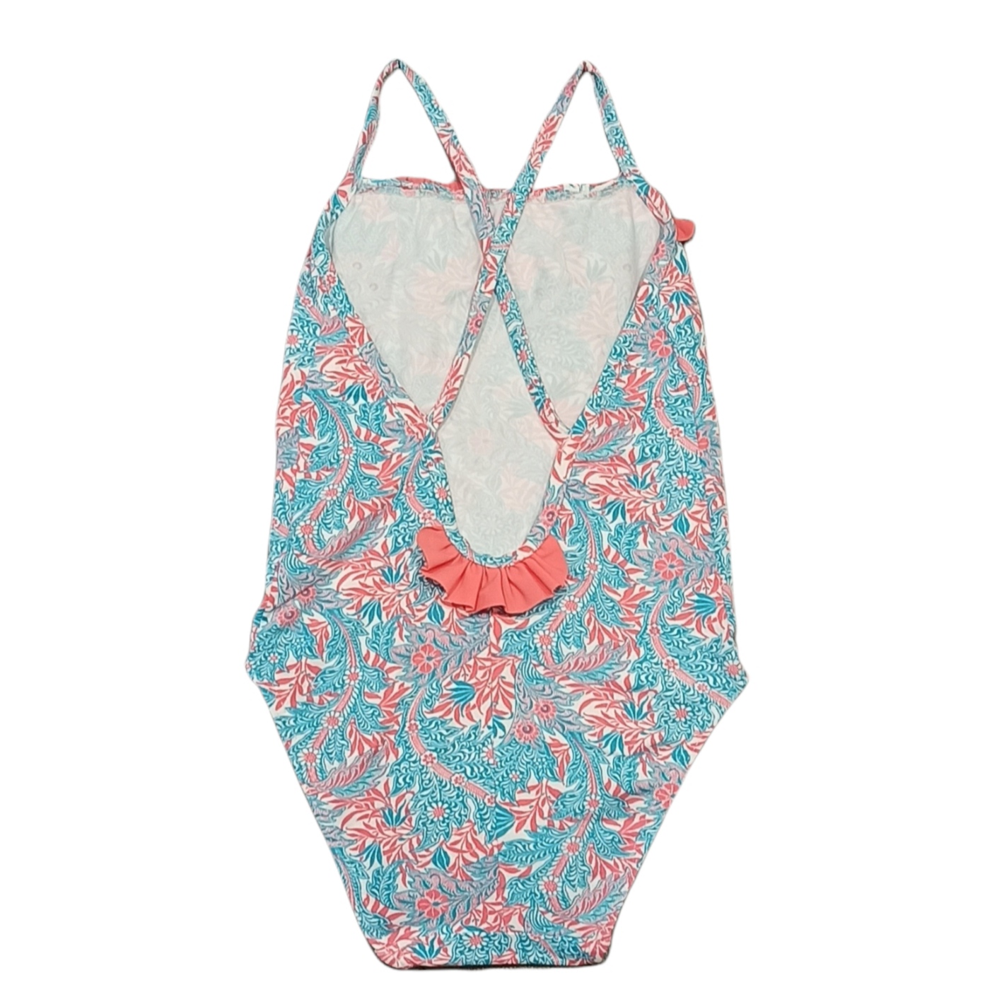 Bañador enterizo de niña modelo Tahití con estampado floral coral y turquesa, detalle de volante y tirantes finos, talla 3 años.