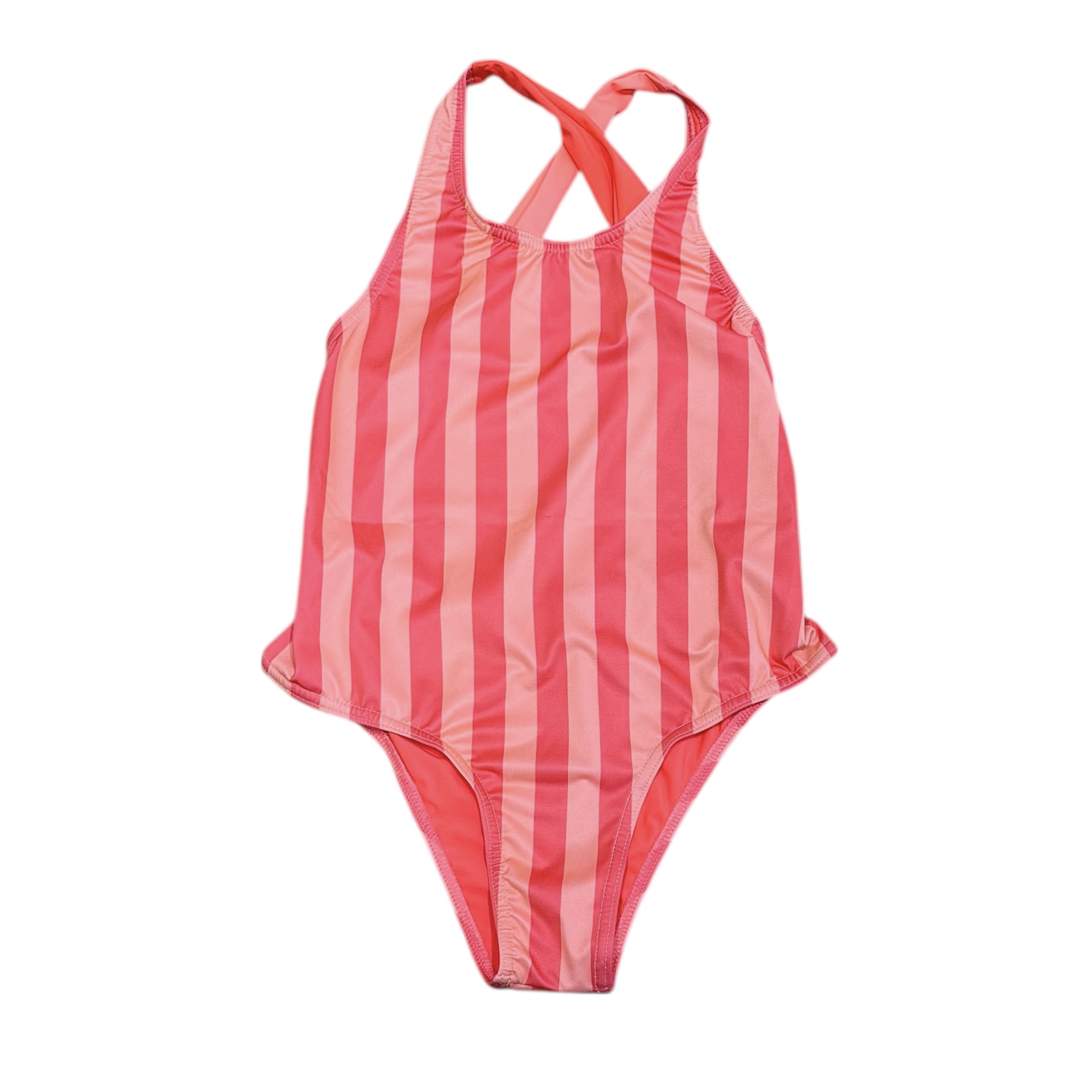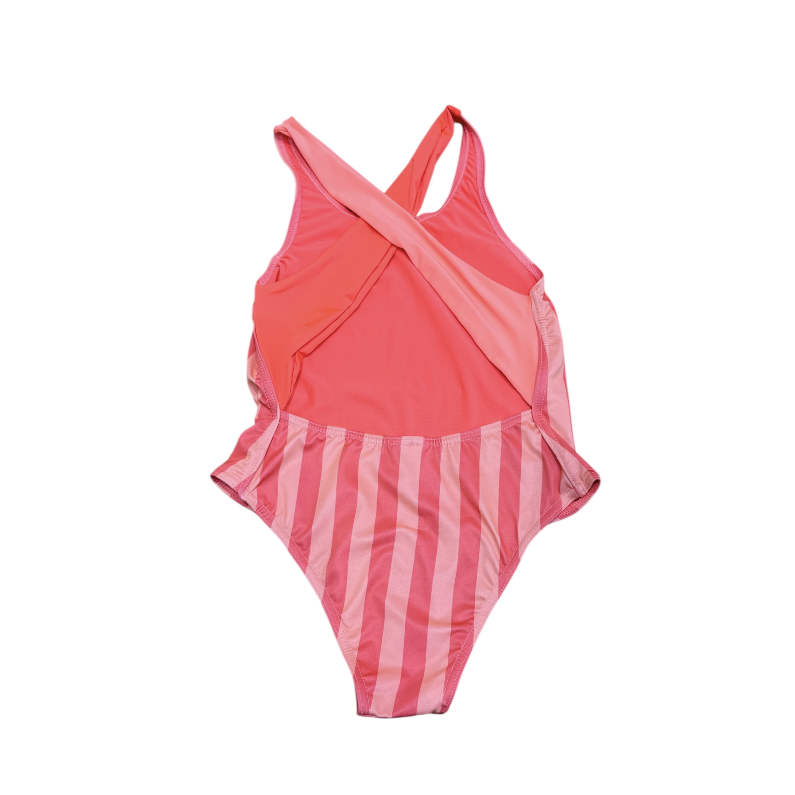 El Bañador Bahamas está diseñado para niñas de 10 a 16 años. Su combinación de coral intenso y rayas verticales en contraste aporta un estilo actual, favorecedor y muy veraniego.