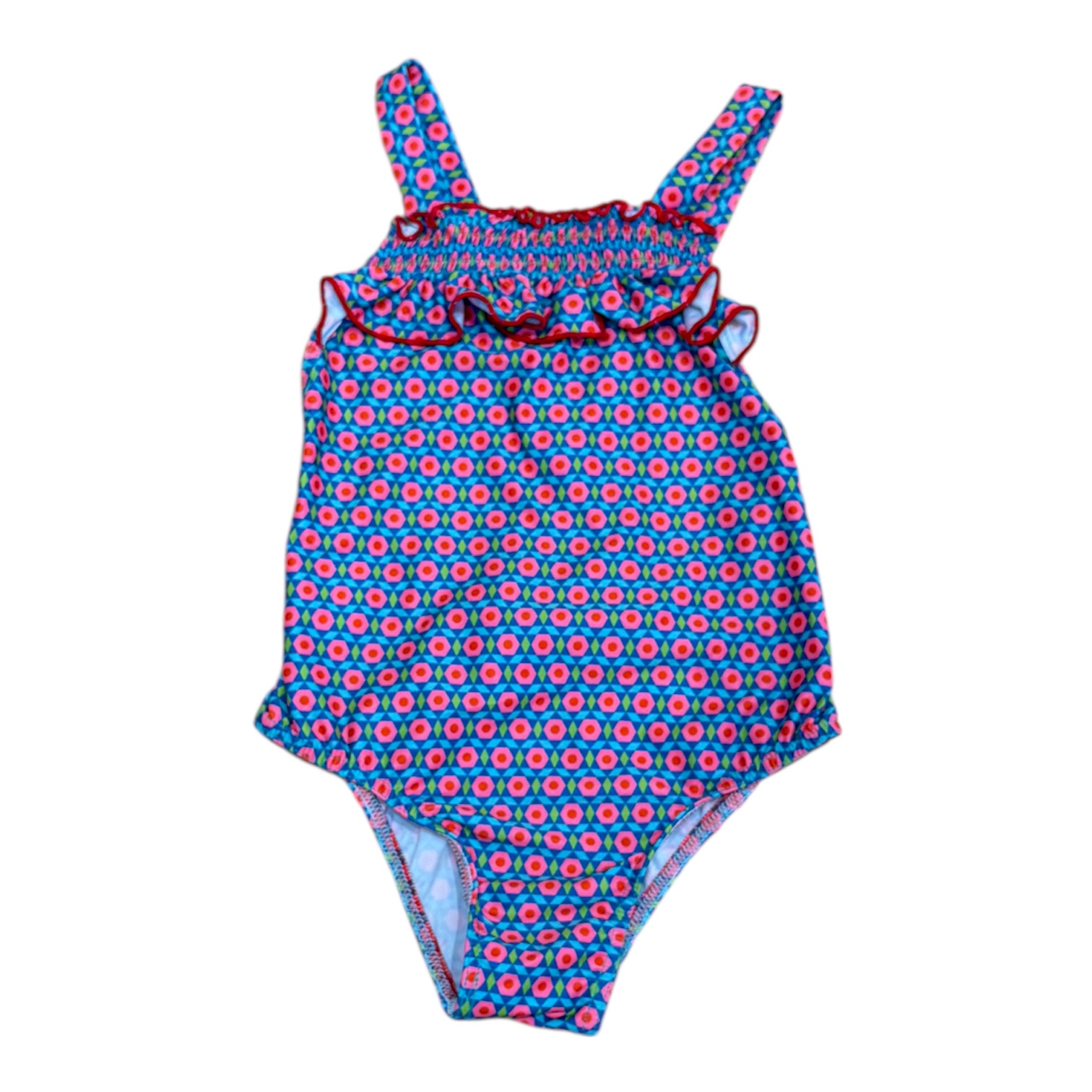 Su diseño incorpora tirantes cómodos y un acabado cuidado en escote y volantes, aportando un toque especial sin perder funcionalidad. Es una prenda pensada para moverse, jugar y disfrutar del verano sin molestias.