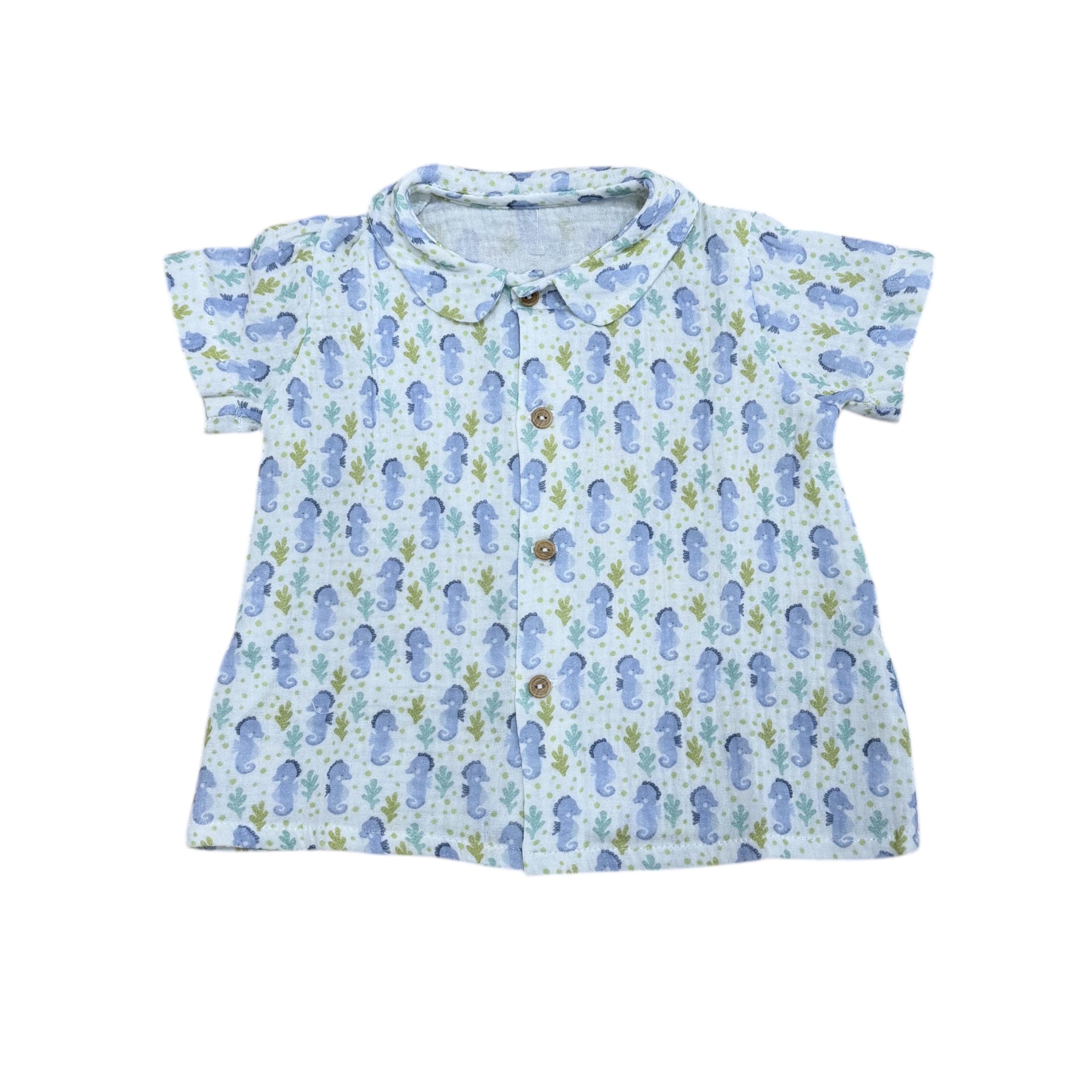 Camisa infantil de algodón ligero, fresca y suave, ideal para los meses de calor. El estampado de caballitos de mar en tonos azules y verdes aporta un aire veraniego y alegre, manteniendo un estilo cuidado y fácil de combinar.