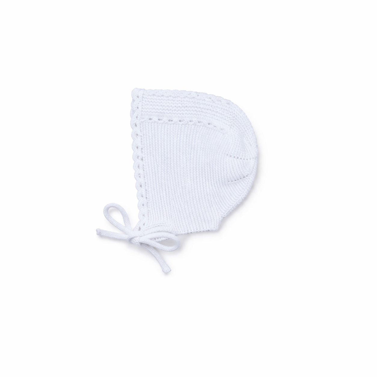 Capota de punto para bebé en color blanco con diseño de ochos, marca Machú, hecha a mano en España con 100% algodón y cierre de lazo