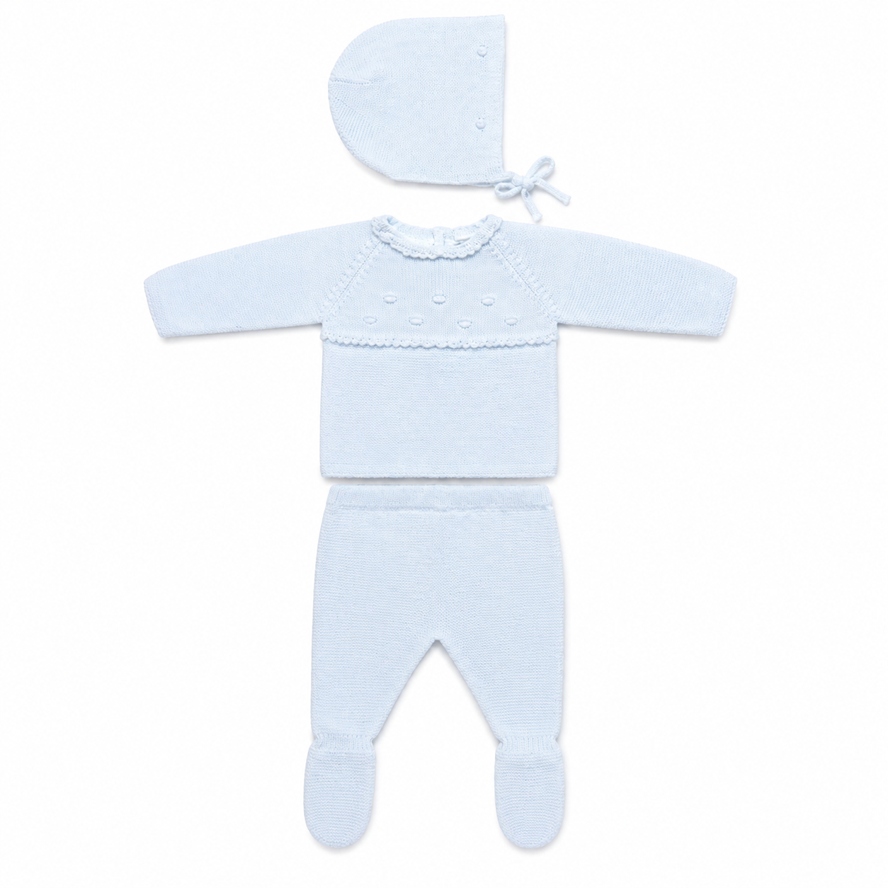 El blanco es el color por excelencia para la primera puesta. Este conjunto coordina de forma impecable con nuestra manta de ochos blanca o con cualquiera de nuestros arrullos de algodón. Es, además, una opción ideal para bautizos o presentaciones familiares.