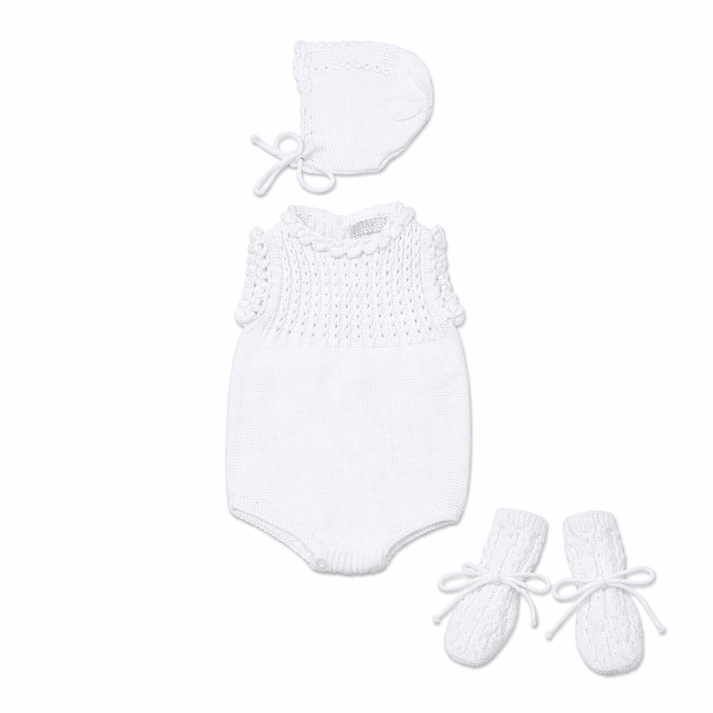 Exclusivo conjunto de tres piezas para bebé en color blanco, compuesto por pelele de punto calado, capota a juego y patucos artesanales. Hecho a mano en España con 100% algodón de tacto extra suave, garantizando el máximo confort para la piel de tu recién nacido. La esencia artesana de Machú en un solo set.