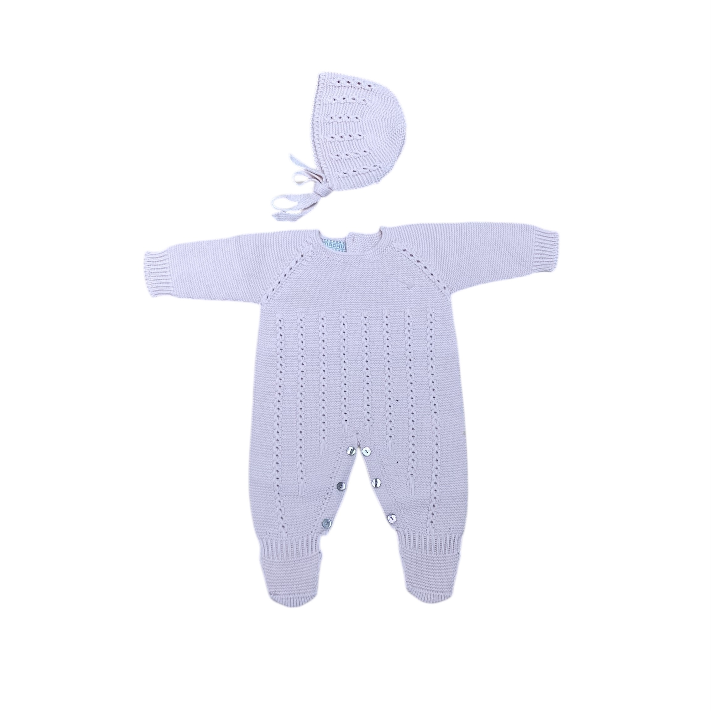 El Conjunto Sicilia es una propuesta clásica y delicada para vestir al recién nacido con elegancia y comodidad. Este conjunto incluye un pelele de punto calado y una capota a juego, ambos confeccionados en punto acrílico de gran suavidad, perfecto para la piel sensible del bebé.