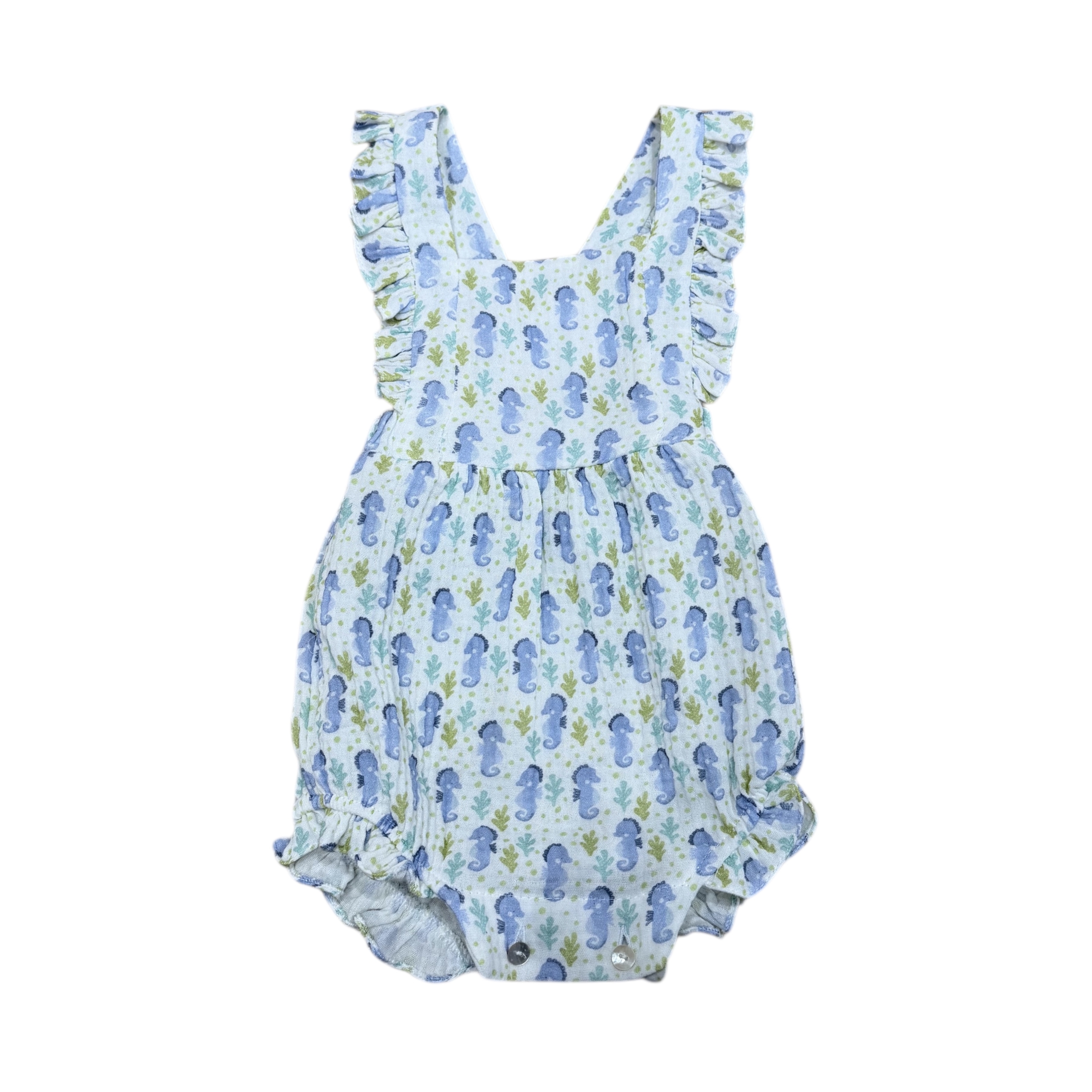Pelele  infantil confeccionada en tejido suave y ligero, pensada para los días de verano. El estampado de caballitos de mar en tonos azules y verdes aporta un aire fresco y alegre, manteniendo un estilo cuidado y atemporal.