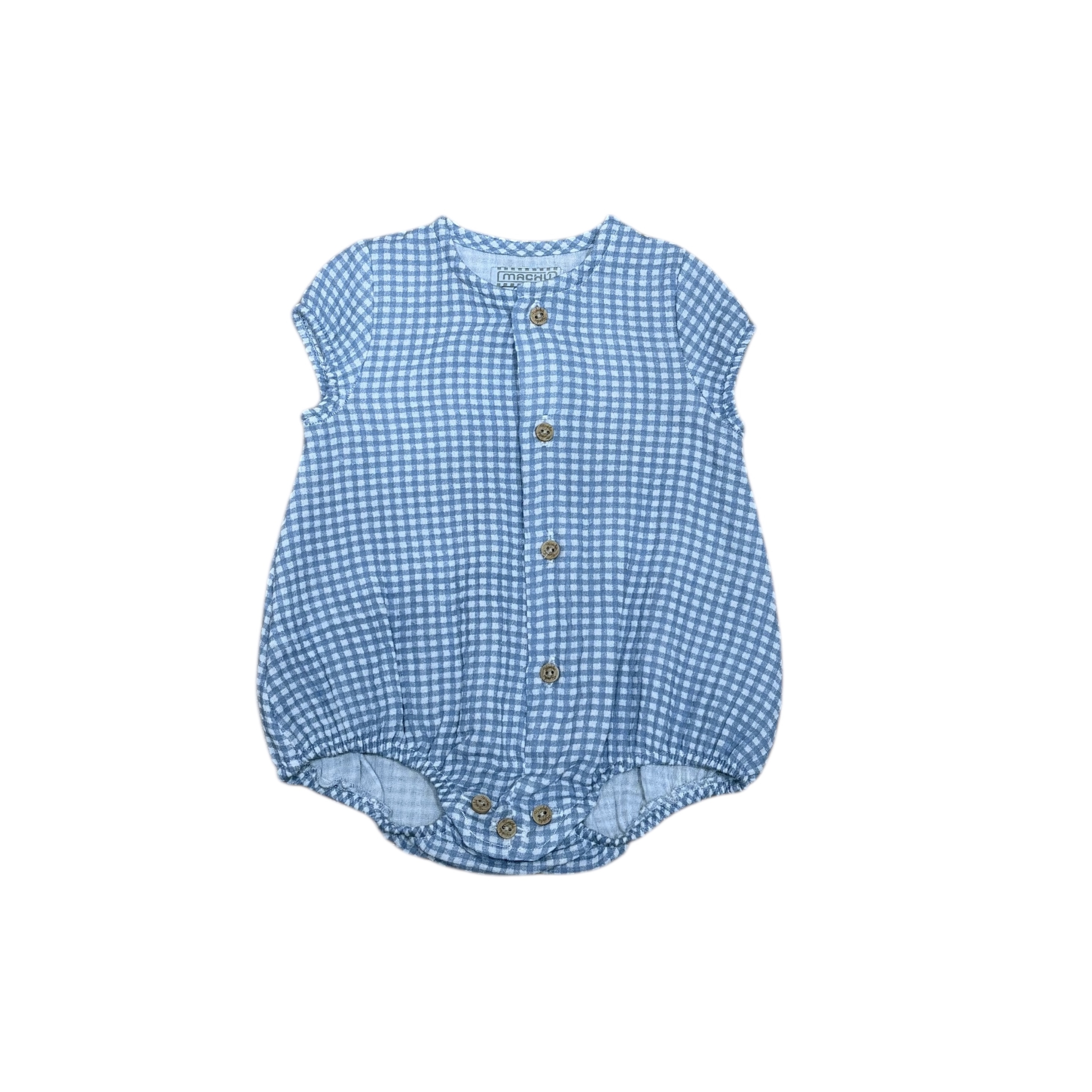 Pelele bebé confeccionado en algodón vichy azul, fresco, ligero y muy agradable al tacto. Un tejido clásico de los de siempre, que nunca falla en la ropa de los primeros meses.