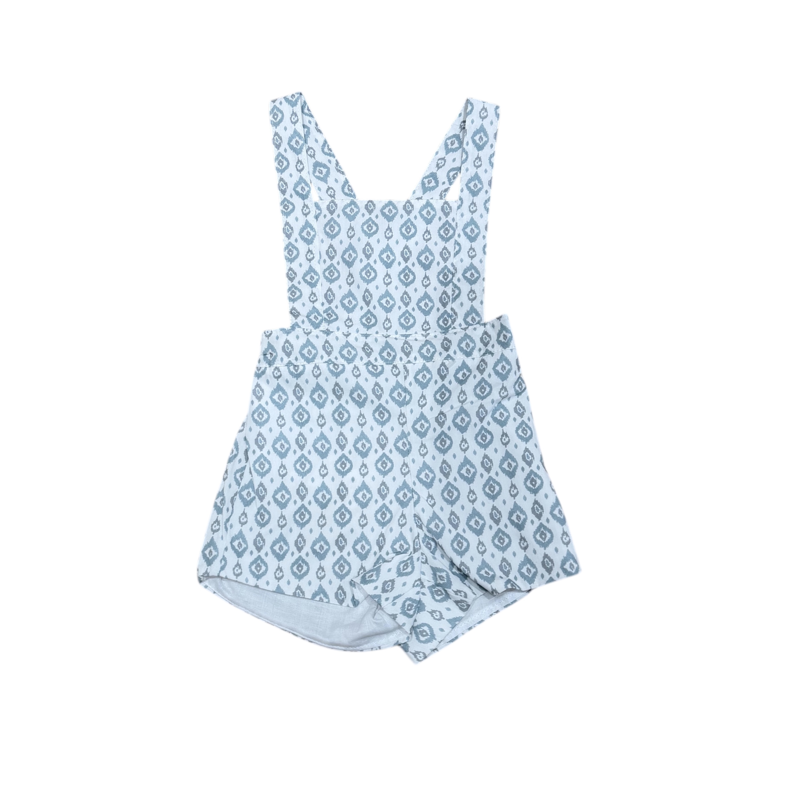 Peto corto infantil confeccionado en algodón estampado en tonos azul suave, ligero y agradable al tacto. El dibujo geométrico aporta personalidad sin estridencias, manteniendo ese equilibrio entre lo clásico y lo actual que nunca pasa de moda.