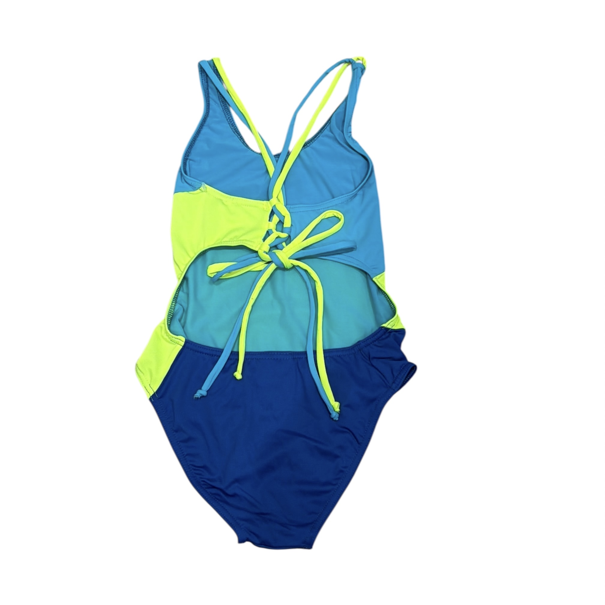 Su diseño incorpora escote deportivo en la parte delantera y tirantes cruzados en la espalda, aportando sujeción y libertad de movimiento. En la zona central cuenta con una lazada ajustable que permite adaptar el trikini al cuerpo con firmeza, reforzando la comodidad sin renunciar al estilo. El contraste entre el azul intenso y el verde flúor realza el bronceado y aporta un aire fresco y juvenil.