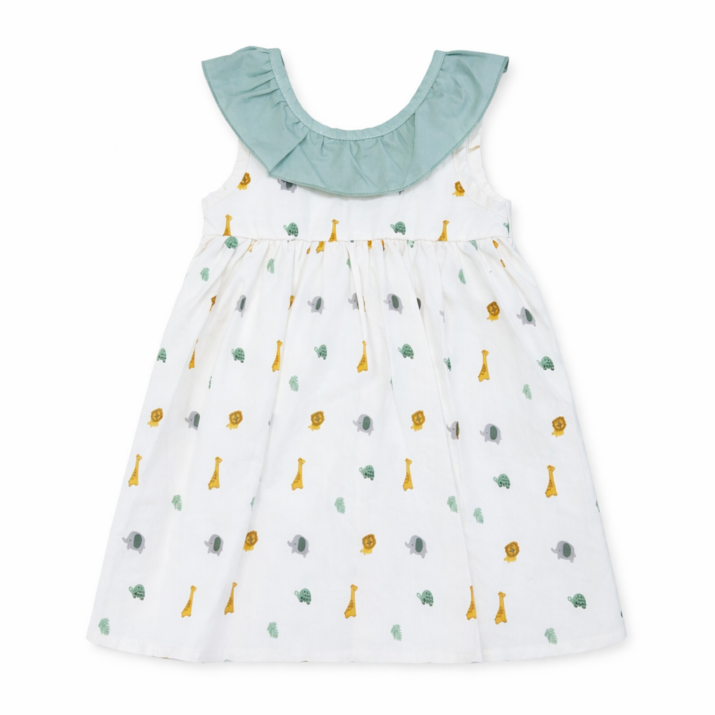 Vestido para niña en 100% algodón blanco con estampado de jirafas y volante verde agua