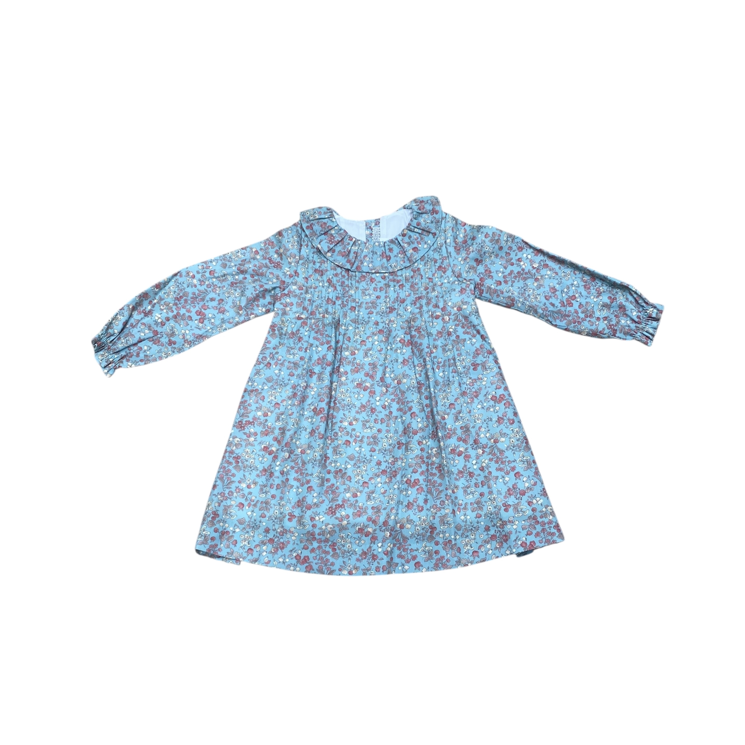 Vestido Luz de niña en 100% algodón, con estampado floral azul, cuello volante y mangas largas con puño engomado. Hecho en España.